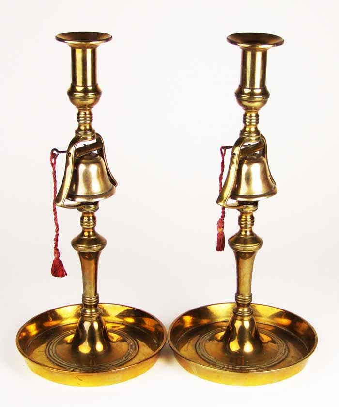 A pair of 19th Century brass tavern candlesticks, fitted with bells, on dished circular bases