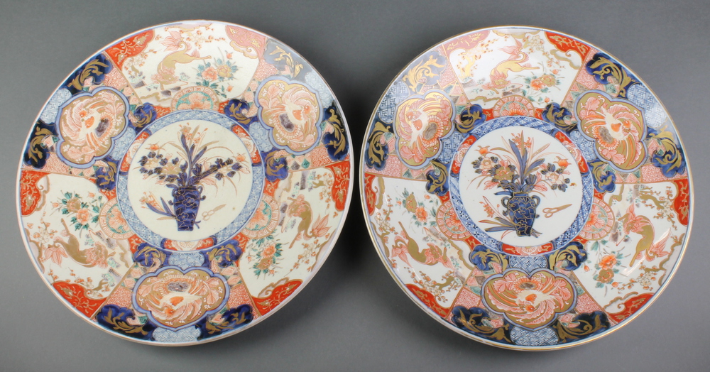 A pair of 19th Century Imari dishes decorated with panels of stylised lions, birds and flowers enclosing a central medallion of a vase of flowers 14"