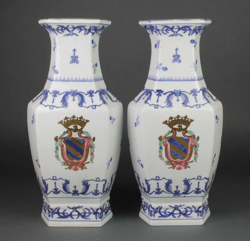 A pair of 20th Century Chinese export style hexagonal blue and white vases decorated