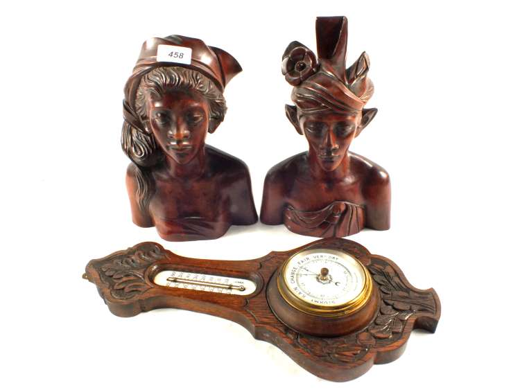 A pair of Balinese hardwood busts and a carved Oak barometer
