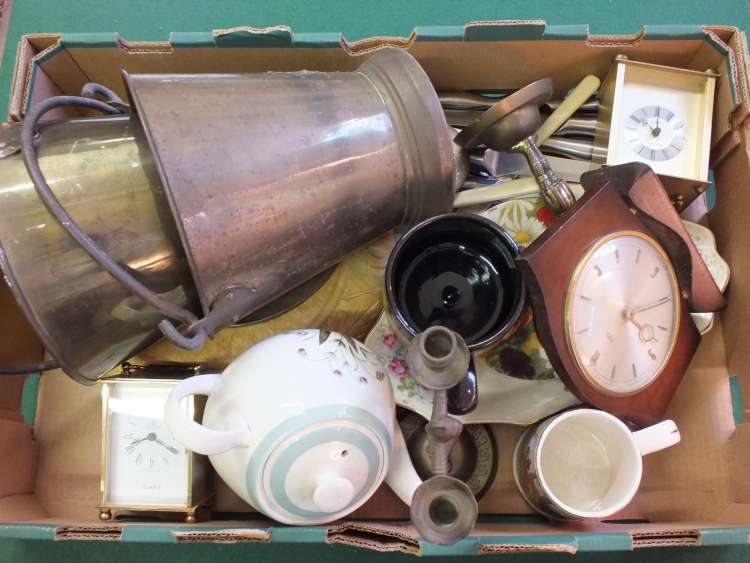 A pair of Brass candelabra, cutlery and sundries