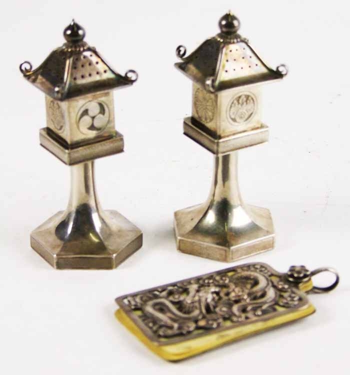 and a pendant notebook with pierced covers, one decorated with bamboo, the other with dragons, maker's mark of Wang Hing & Co., height 7.5 cm (3 in.), (3)