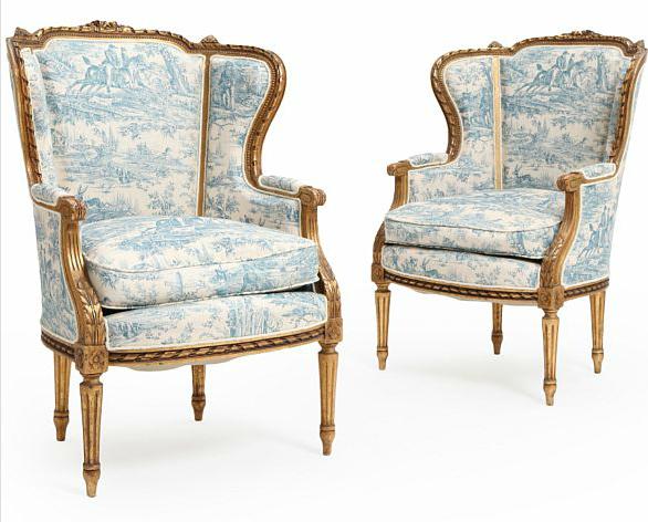 A pair of circa 1900 gilded Louis XVI style bergeres, carved with foliage