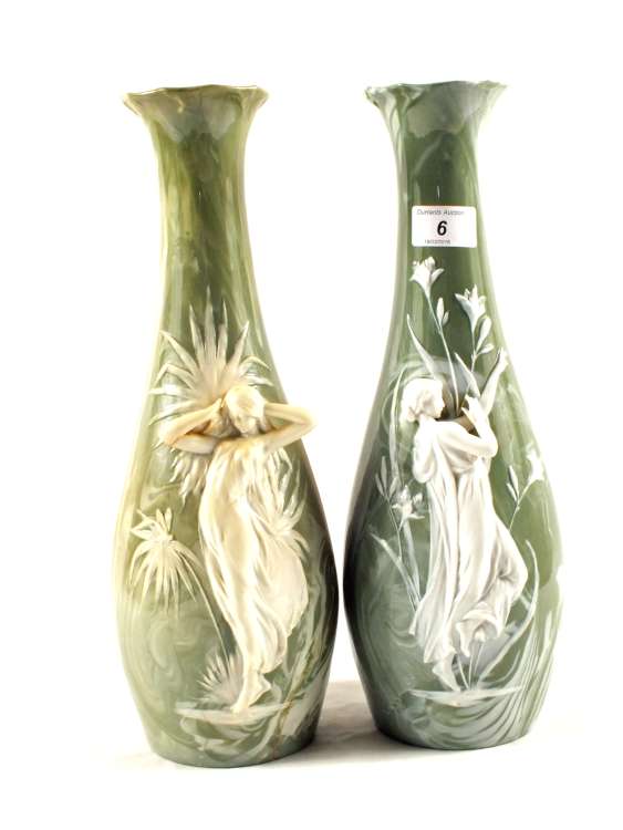 A pair of continental agate glazed vases with relief lady decoration (one cracked)
