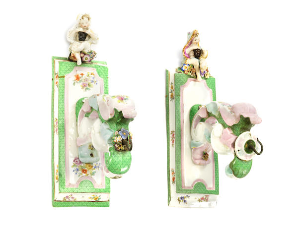A pair of early 20th century Continental porcelain single light wall appliques, early 20th century