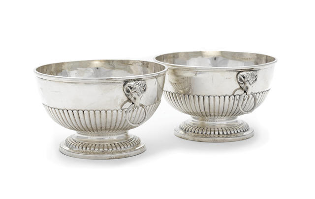 Each stop-reeded with ram's mask handles over a reeded foot, total weight approximately 37.75oz troy