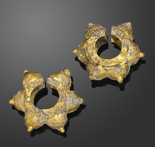 Each large hoop encircled by six repoussé convex disks, with a small central boss attached to the perimeter of a wide gold band open to the top (some encrustation)