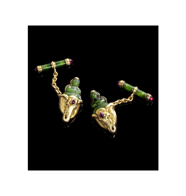 each link with seated nephrite figure surmounting elephant mask enriched at foreheads of each with cabochon rubies, connected by a gold-link chain to a nephrite bar with gold mounts terminating in further cabochon rubies