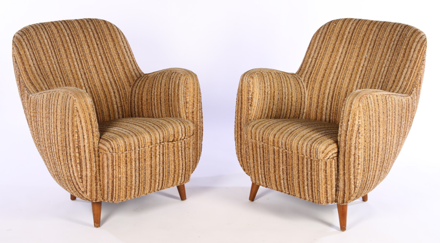 in the manner of Gio Ponti having curved backs raised on turned and tapered legs