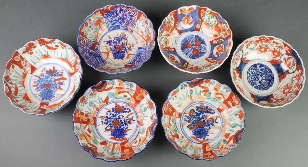 A pair of late 19th Century Imari scalloped bowls decorated with a vase of flowers amongst panels of flowers and trees 6", 4 similar bowls