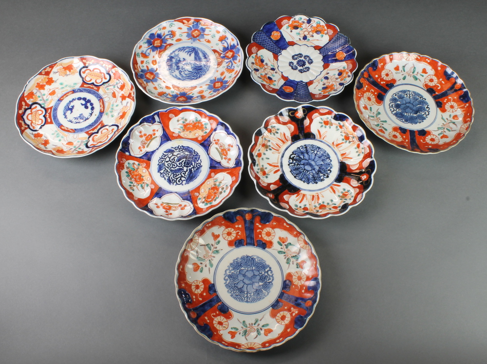 A pair of late 19th Century Imari scalloped dishes with panels of flowers 9" and 5 others