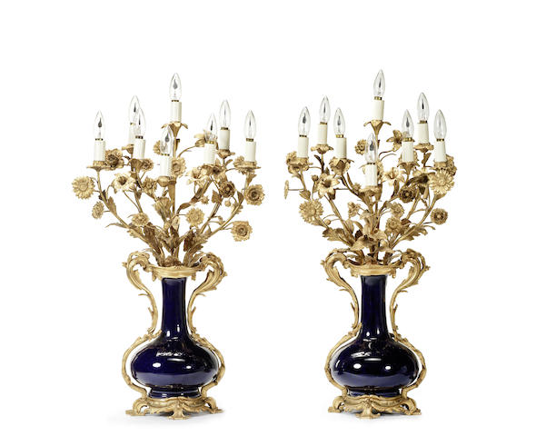 A pair of late 19th / early 20th century French gilt bronze and blue porcelain candelabra, late 19th / early 20th century