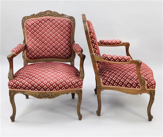 A pair of Louis XV style walnut fauteuils, with scroll carved frames