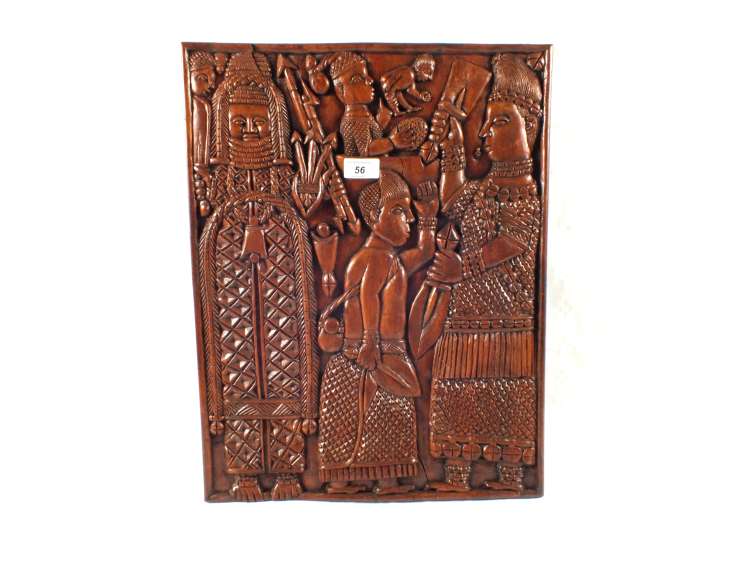A pair of Nigerian Obi carved wooden panels depicting ceremonial figures