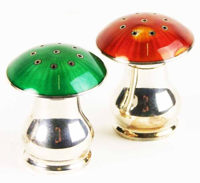 A pair of Norwegian enamelled peppers, in the form of toadstools, one with red top and the other with green