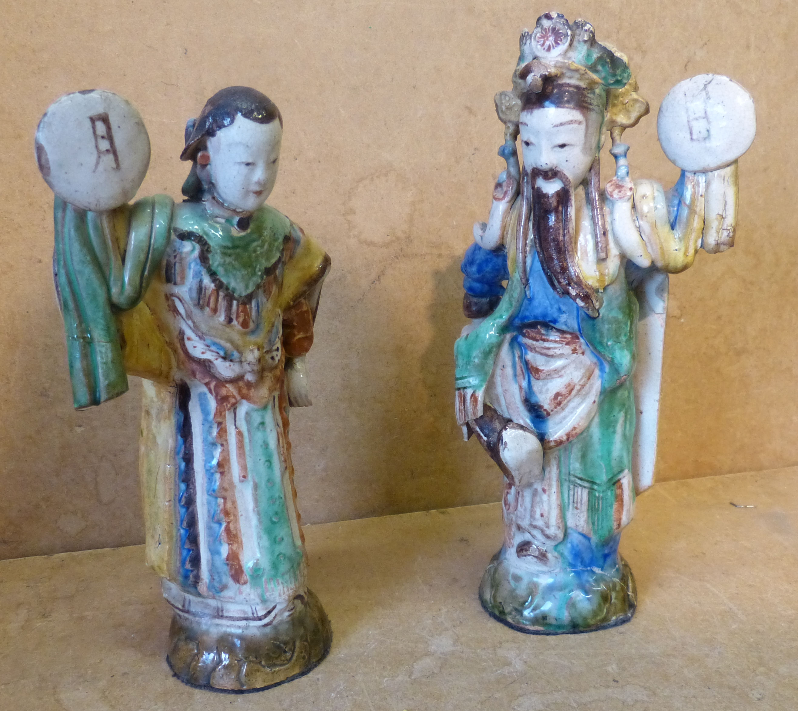 A Pair Of Oriental Glazed Earthenware Figures of gentleman and lady on multicoloured ground