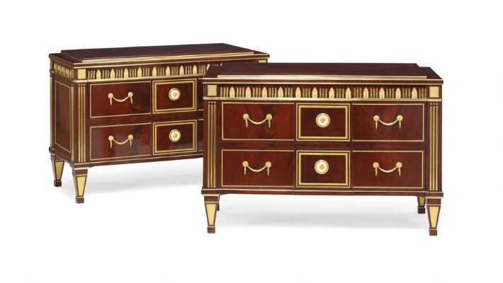 A pair of Russian Neoclassical style gilt bronze mounted and brass inlaid mahogany commodes