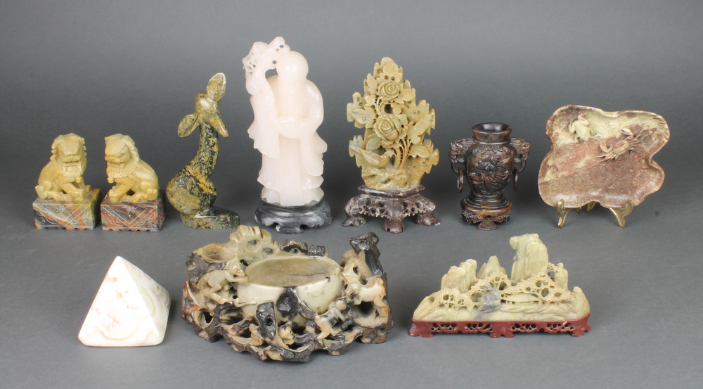 A pair of soapstone figures of seated shi shii 3 1/2", a leaf shaped brush washer decorated with a crab and frog 5 1/2", 4 other soapstone carvings and a carved hardstone figure of Shou Lao