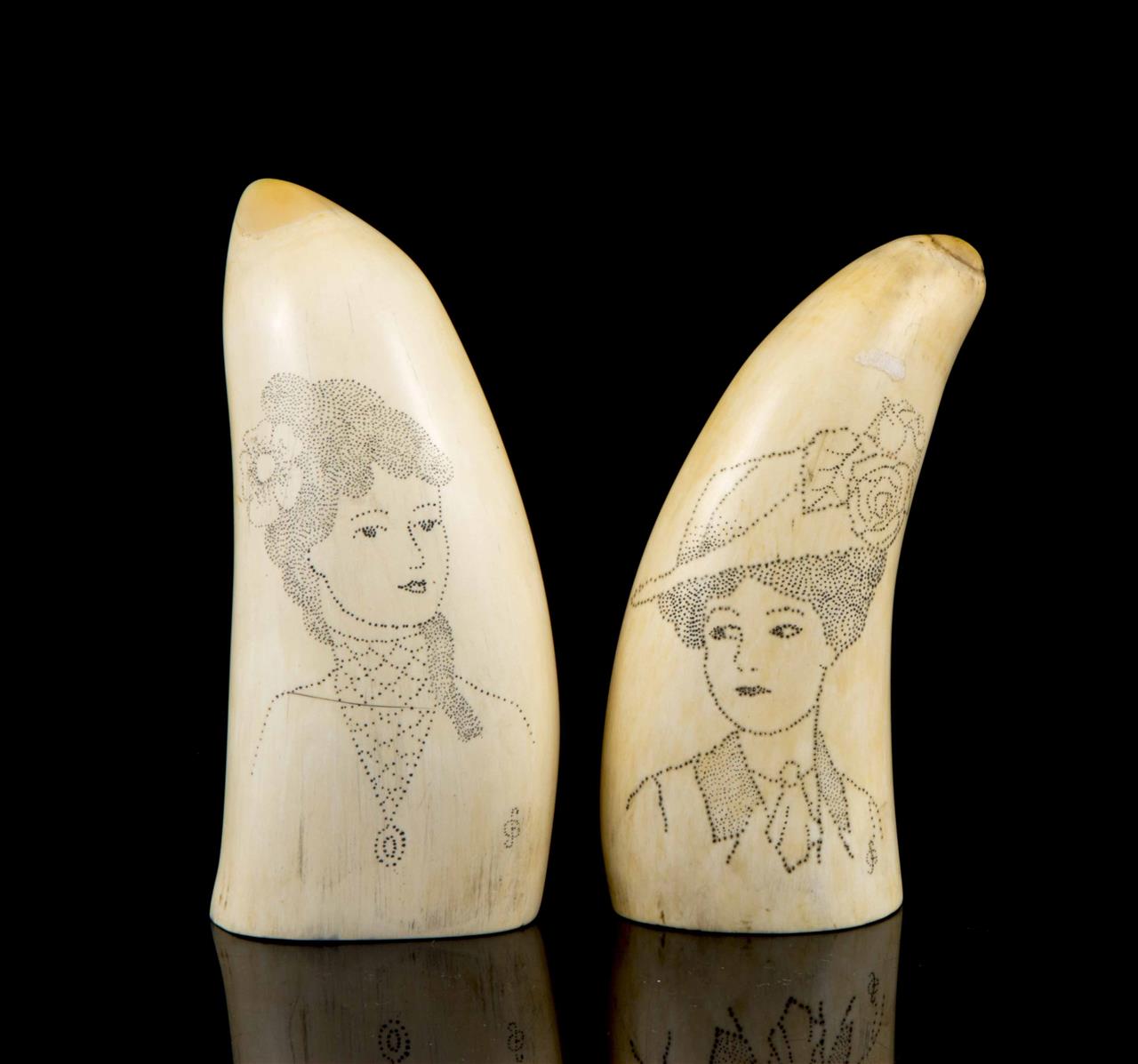 A pair of stippled scrimshaw whale's teeth