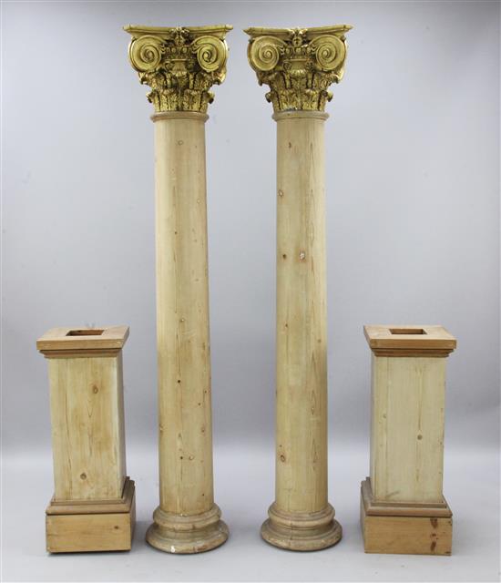 A pair of stripped pine columns, with square bases and gilt Corinthian capitals