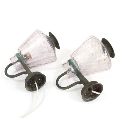 A pair of wall lamps of patinated copper, shades of patterned glass