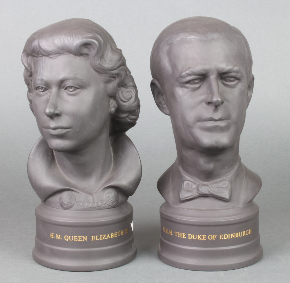 A pair of Wedgwood black basalt limited edition commemorative busts of HM Queen Elizabeth II and HRH The Duke of Edinburgh with certificates no. 427/750 9"