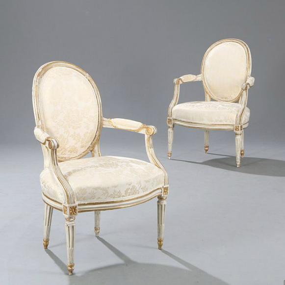 A pair of white-painted and partially gilt Danish Louis XVI armchairs