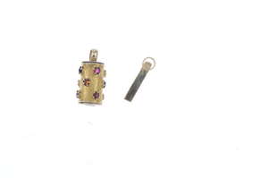 A paste clasp. Of cylindrical design, with scattered multi-colour paste accents. Length 2.1cms. Weight 2.5gms.