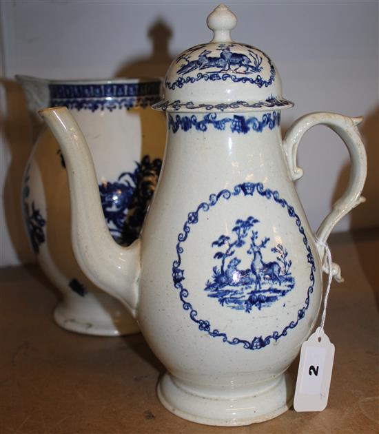 A Pennington's Liverpool blue and white coffee pot and cover and a similar jug, c.1780-90, the coffee pot printed with deer, the jug with flowers, 27 and 23cm