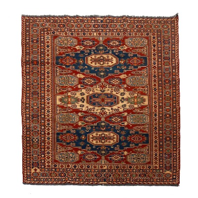 A Persian 20th century Beloutch Sumak carpet in classic Caucasian design, geometric patterns on reddish base. 270×218 cm.