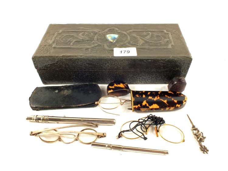 A Pewter box containing Silver spectacles, a further pair in a Tortoiseshell case and other items