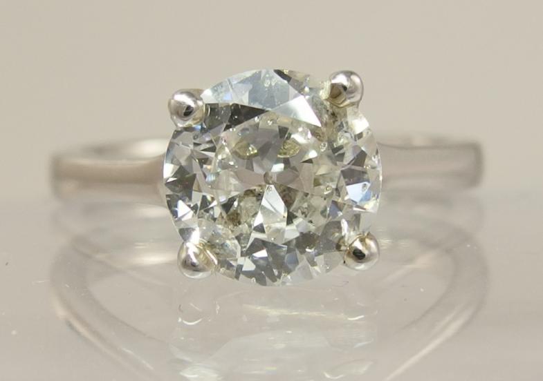 clarity I1, cut Fair, polish and symmetry both good. In a modern platinum setting, with plain band to the four prong elevated setting, finger size N