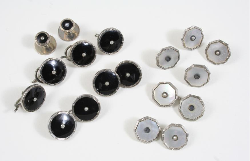 A QUANTITY OF SILVER AND BLACK ONYX CUFFLINKS AND DRESS STUDS