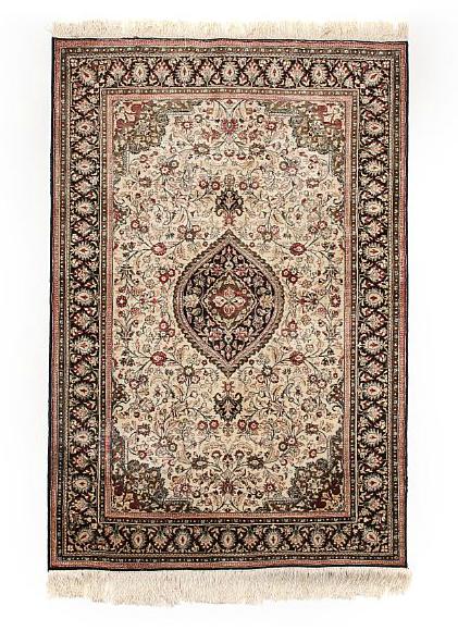 A Qum silk rug, medallion design with ornamentation, flowers and foliage on light base