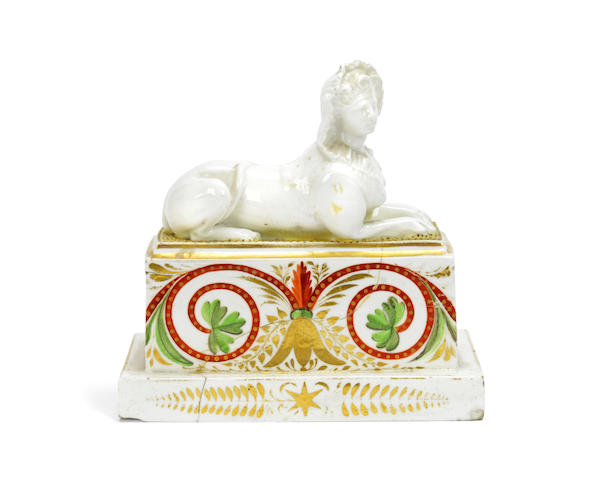 A rare late 18th century Derby porcelain model of a recumbent sphinx