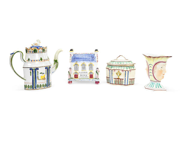 together with a Portobello type money box in the form of a house, a pearlware double maskhead vase and a Prattware type sucrier and cover the coffee pot of oval form with crenallated rim and swan finial lid, the money box inscribed SAVING BANK, the m