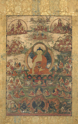 Distemper on cloth; Shakyamuni seated in the center of a paradisiacal landscape surrounded by groups of Gelugpa and Shakya hierarchs