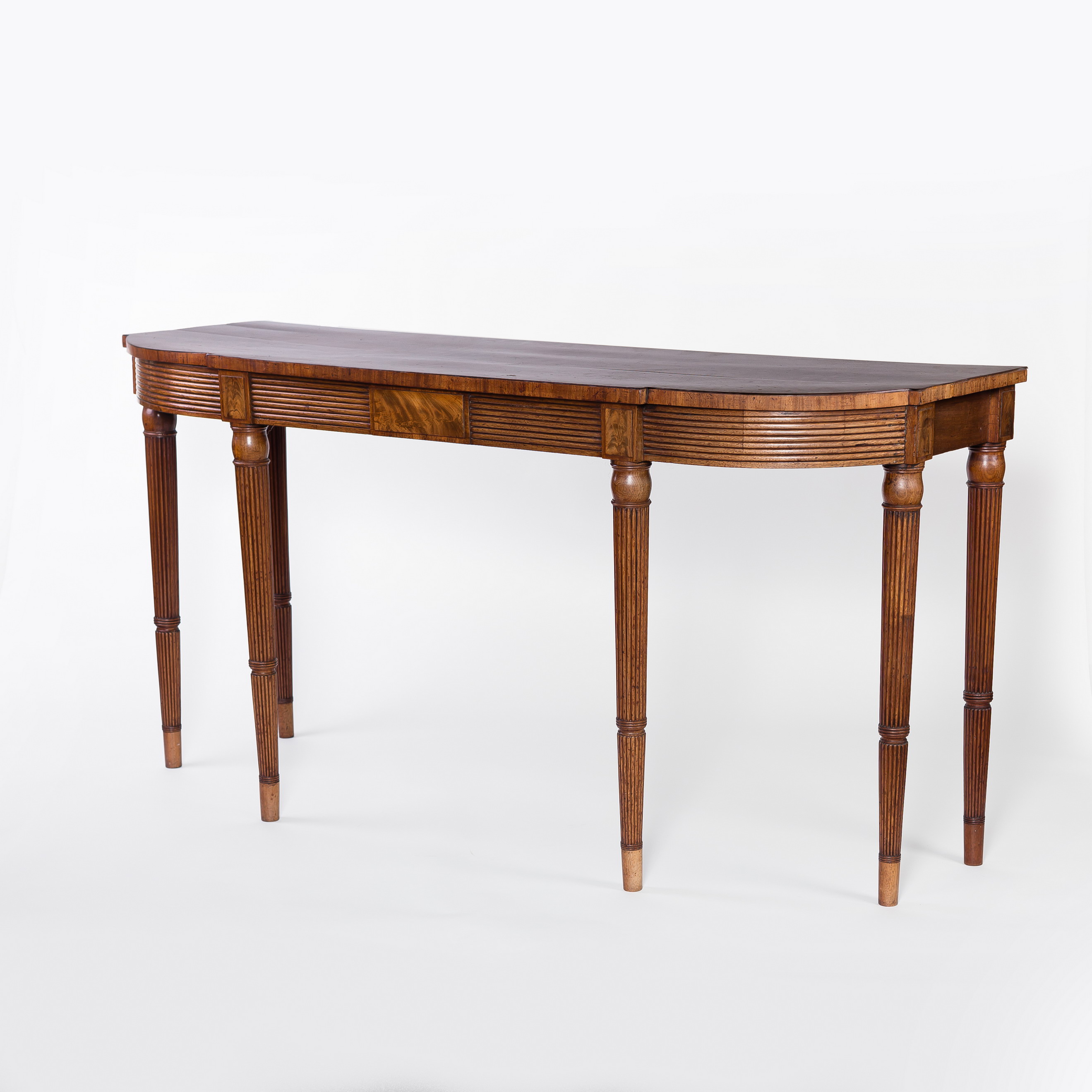 A Regency mahogany serving table, with break bowfront top on reeded and panelled frieze on turned tapering reeded legs