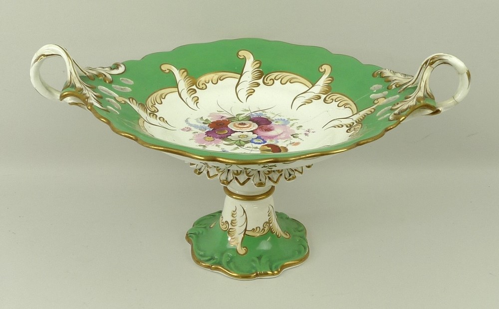 A Ridgways porcelain dessert service, early 18th century, painted with floral sprays against a yellow and gilt leaf and green banded border, comprising comport, pair of oval dishes, pair of rectangular dishes, four leaf shaped dishes, and twenty four