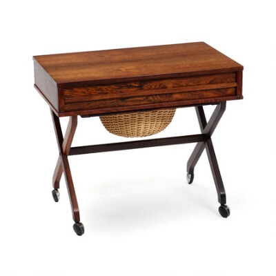 A rosewood sewing cart on wheels with underlaying cane basket and drawer
