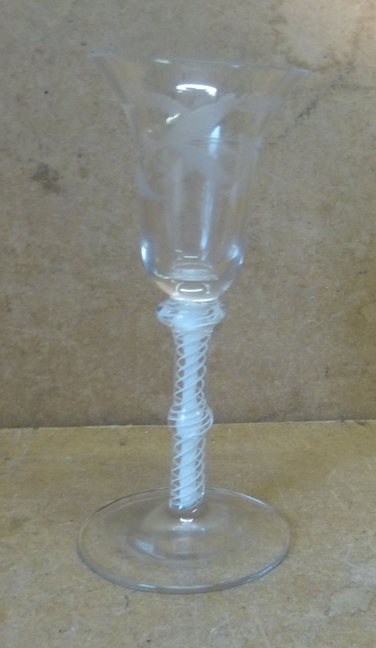 A Round Trumpet Shape Wine Glass having engraved leaf decoration with opaque twist stem on round base
