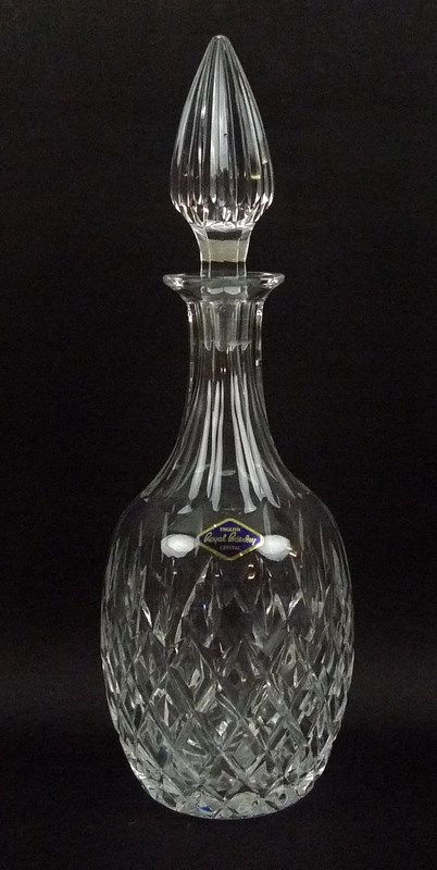 A Royal Brierley cut glass decanter, with tear drop shaped stopper and original label