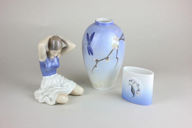 A Royal Copenhagen porcelain figure of a seated girl tying her hair, 12cm, a vase 14cm, and a small oval vase, 6cm, decorated with flowers.
