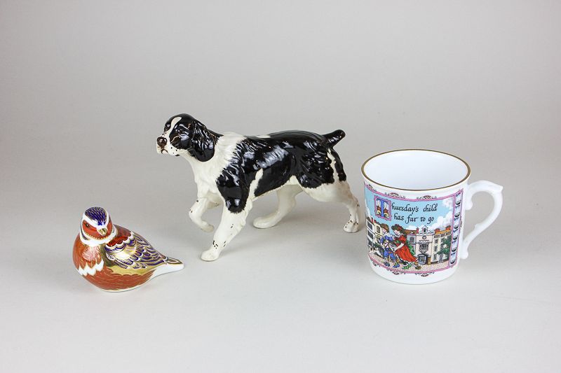 a Royal Doulton porcelain figure of a springer spaniel and a Royal Worcester Thursday's Child birthday mug, all with original box