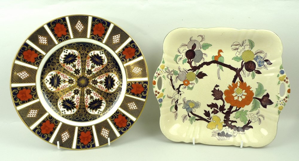 A Royal Crown Derby Imari plate, marked 1128 XLII, 27cm, and a Masons Patent Ironstone China plate, square with two handles, 24