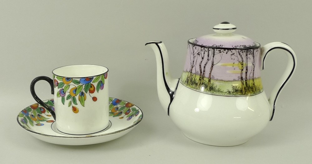 A Royal Doulton bachelor tea set, RdNo 718210, in pink ground with birch tree detail, comprising tea pot, milk jug, sugar bowl, tea cup, saucer, and plate, together with six Crown Staffordshire coffee cans and saucers. (18)