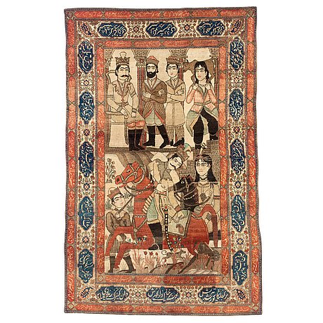211 x 136,5 cm. An ivory ground with polychrome palace and landscape scenes with historical and mythological persons. An ivory main border with flowers, boteh patterns and cartouches with inscriptions.