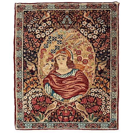 79,5 x 64,5 cm. A dark blue ground with polychrome birds and blooming branches as well as a portrait medallion. An ivory main border with a flower vine.