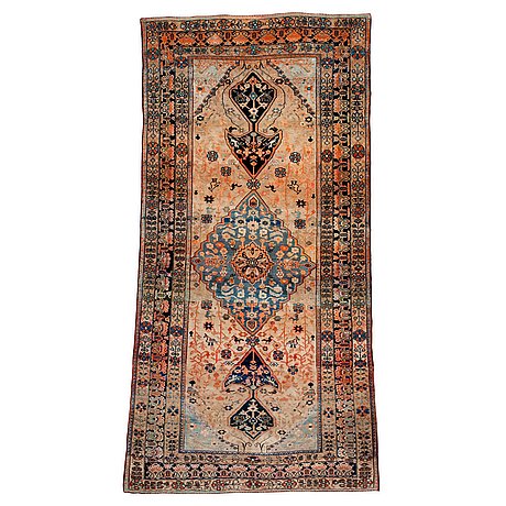 200 x 95,5-108 cm. A camel hair coloured ground with a large polychrome medallion, birds, stylized flowers and corner ornaments. A narrow dark blue melange main border with a boteh pattern and flower bouquets.