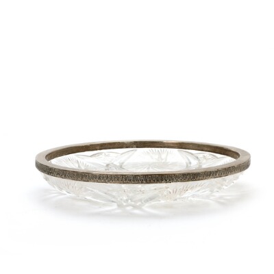 A Russian cut crystal dish with silver rim. Indistinct marks